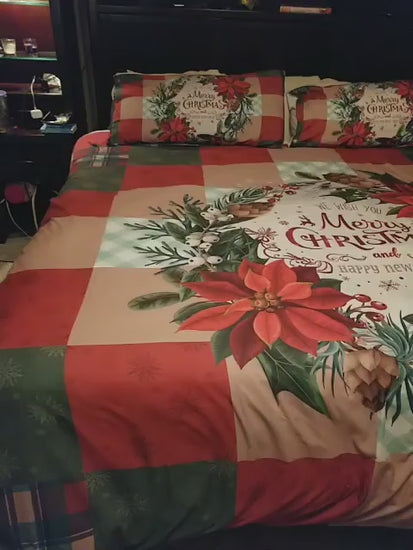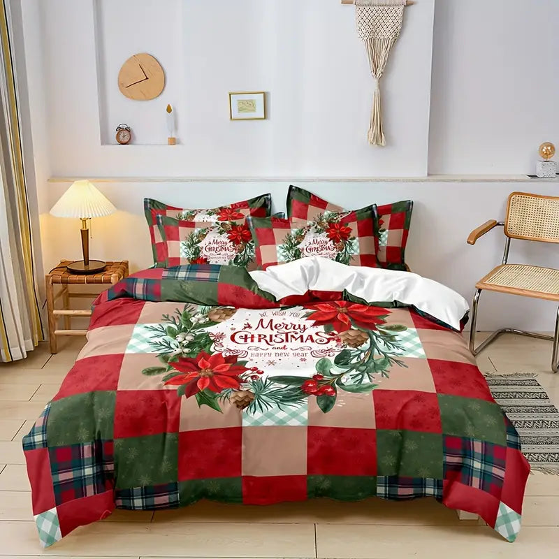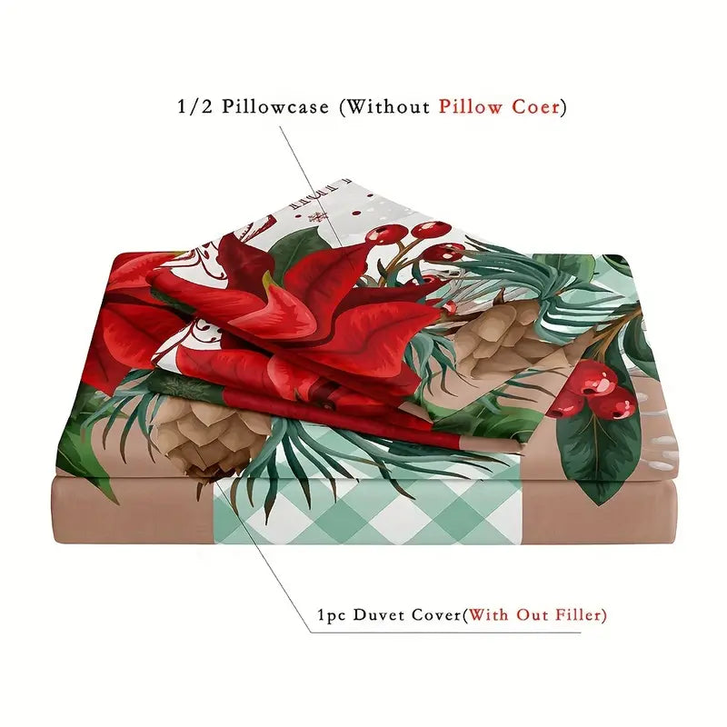 3Pcs Christmas Theme Santa Snowman Tree Elk Snowflake Checked Duvet Cover Set