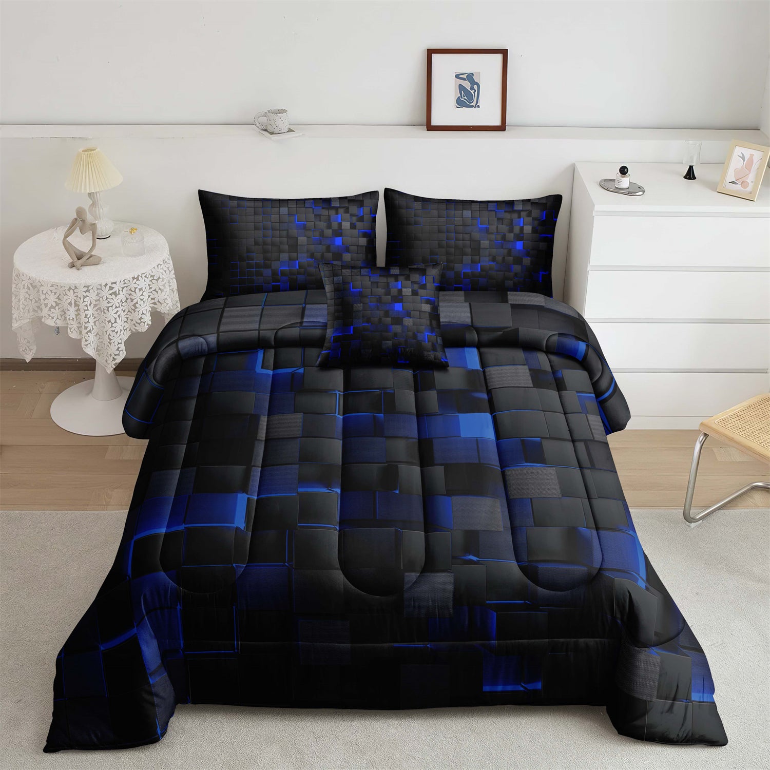 3Pcs Geometric Blue & Red Grid Checked Comforter Set