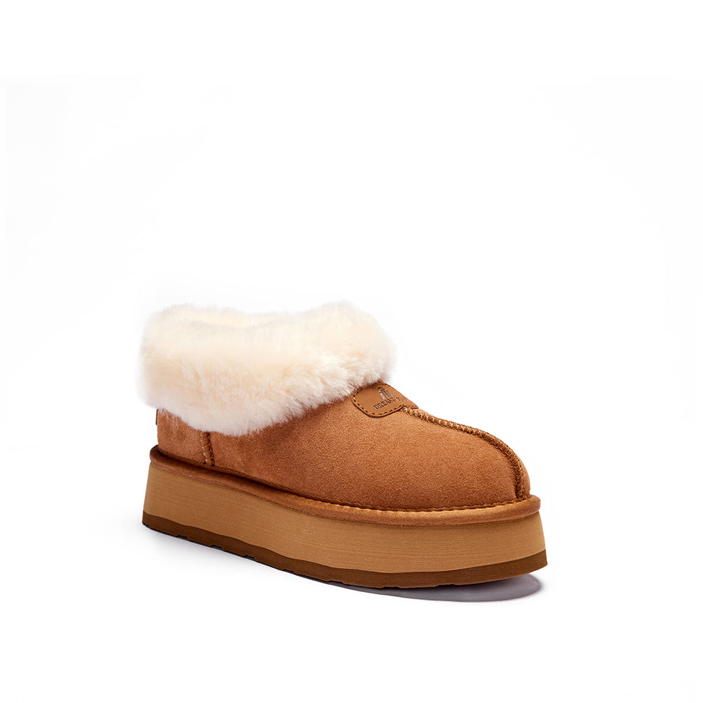 Stay cozy and chic with our DREAMMERINO Platinum Platform Slippers! Made of luxe sheepskin wool that'll keep your feet warm and comfy, but also features a water-resistant upper so that it's easy to clean. It's the perfect combination of style & convenience. Plus, the mod design gives it a little extra comfort that you can rock at home or on the street. So slip into style with these slippers!